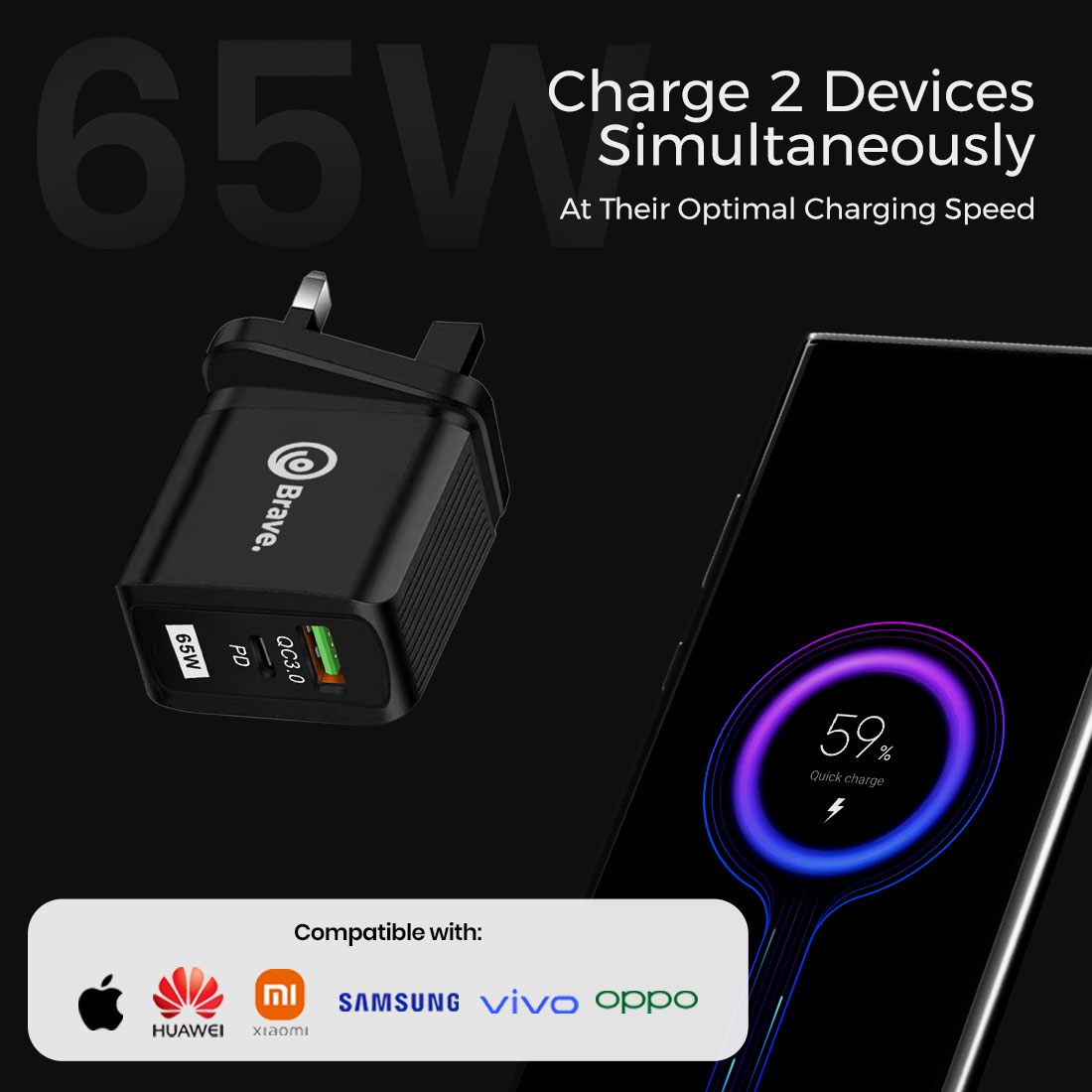 Charge up to three devices at once with a total output of 67W using the two USB-C ports and one USB-A port. When all three devices are connected, the USB-C 1 port delivers 45W of power through PPS / PD charging.